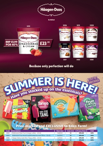 Bec%u00e4use only perfection will doRRP %u00a35.99 POR 40% %u00a323.9930068x460ml3012 3012 30082257 3022 3030Please note: Carton design allows for products to be merchandised in both portrait or landscape format.Price-marked and EXCLUSIVE to Eden Farm!Code Description Pack Size Case Size Promo Price POR2884 Robinsons Real Fruit Orange Lollies %u2013 %u00a33.50 4x60ml 12 %u00a319.49 44%2885 Robinsons Fruit Shoot Apple & Blackcurrant Minis %u2013 %u00a33.50 6x30ml 12 %u00a319.49 44%2886 Tango Cherry Sub-Zero Tang Lollies %u2013 %u00a33.50 4x70ml 12 %u00a319.49 44%2887 Drumstick Squashies Original Lollies %u2013 %u00a33.50 4x70ml 12 %u00a319.49 44%