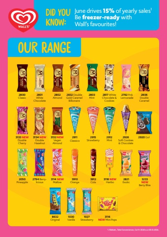 1. Nielsen, Total Convenience, Cal Yr 2024 w.e 28.12.2024.2800Classic2801White Chocolate2817 White Chocolate & Cookies2050 Pineapple8632 Original2821 Exotic3233 NEW Berry Bliss2794 Berrylicious3114 NEW Mallow1030 Vanilla3910 Orange3912 Cola1027 Strawberry3118 NEW Haribo3116NEW Mini Pops2792 Pink Lemonade2806Double Caramel3133 NEWDouble Cherry3134 NEWDouble Hazelnut3132 NEWVegan Almond2802Almond2803Mint2832 Double Gold Caramel Billionaire2911Classico2926Soft Cookies & Chocolate2915 2920 Go!Strawberry2912MintJune drives 15% of yearly sales1Be freezer-ready withWall%u2019s favourites!DID you knoW:our rangE