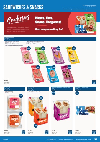 SANDWICHES & SNACKS You can order any chilled product in either single units or full casesV = Suitable for Vegetarian H = Certified Halal7 - 15DAYS70612 7061170612706157061470611Cheese & Ham SandwichEgg Mayo SandwichChicken Tikka SandwichDouble Cheese & Onion Sandwich70610 7061370879Chicken & Bacon Mayo Sandwich Tuna Mayo SandwichCheese & Pickle Sandwich%u00a31.53RRP: %u00a32.25 POR: 32%70610 70613 70879Snacksters range is long life, and can be ordered in single units or full cases, these work on a day 1 for day 2 deliveryWhat are you waiting for?Heat. Eat. Save. Repeat!Snacksters Sandwich110g-145gCase Size: 1071049Snacksters Hoisin Duck & Chicken Wrap147gCase Size: 670615 706147104471019Chicken Caesar WrapChicken Fajita Wrap7104471019Snacksters Wraps170g-180gCase Size: 671472714737 - 15DAYS%u00a32.05RRP: %u00a32.69 POR: 24%7147271473Bacon BapSausage BapSnacksters Bap100g-160gCase Size: 67 - 15DAYS%u00a32.19RRP: %u00a32.79 POR: 22%7 - 15DAYS%u00a31.82RRP: %u00a32.50 POR: 27%%u00a31.65RRP: %u00a32.20 POR: 25%7 - 15DAYS71211Snacksters XL Doner Kebab171gCase Size: 6Chilled t: 0191 586 1111 www.eden-farm.co.uk e: sales@eden-farm.co.uk 31