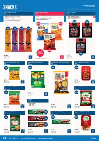 7 - 15DAYS71620%u00a31.18RRP: %u00a31.60POR: 26%Peperami Chicken Tikka Bites45gCase Size: 8SNACKS V = Suitable for Vegetarian H = Certified Halal713804 - 6DAYS70707%u00a31.20RRP: %u00a31.69 POR: 29%7 - 15DAYS70283%u00a31.04RRP: %u00a31.40 POR: 26%60+DAYSPeperami Original Wideboy40gCase Size: 20702887028770286Original HotFirestick%u00a30.80RRP: %u00a31.10 POR: 27%60+DAYS702877028670288Peperami22.5gCase Size: 24Richmond Mini Pork Sausages63gCase Size: 67051070511Original Chicken on a StickChinese Chicken on a Stick70512 70513Nice & Spicy Chicken on a Stick Vindaloo Chicken on a Stick4 - 8DAYS5 - 7DAYS%u00a31.29RRP: %u00a31.69POR: 24%Fridge Raiders Cheesy Nacho Poppers 68gCase Size: 670510 70511 70512 7051371619 7 - 15DAYS%u00a31.18RRP: %u00a31.60 POR: 26%Peperami Roasted Chicken Bites45gCase Size: 871441%u00a31.86RRP: %u00a32.35 POR: 21%4 - 6DAYSWall%u2019s Breaded Chicken Straws168gCase Size: 6Pork Farms Mini Pork Cocktail Sausages200gCase Size: 6%u00a31.98RRP: %u00a32.55 POR: 22%7458720 - 30DAYSPeperami Pizza Bun Original75gCase Size: 8%u00a31.49RRP: %u00a31.95 POR: 24%702737027470809Southern Style Chicken BitesSlow Roasted Chicken Bites BBQ Chicken Bites7 - 15DAYS70273Fridge Raiders Chicken Bites60gCase Size: 6%u00a31.05TLP: %u00a31.15 RRP: %u00a31.6034% POR7080970274%u00a31.57RRP: %u00a32.15 POR: 27%7 - 15DAYS70294Peperami and Cheese Snack Box 50gCase Size: 6Jack Link%u2019s Beef Jerky25gCase Size: 12702957029670964Original Beef JerkySweet & Hot Beef JerkyTeriyaki Beef Jerky%u00a31.32RRP: %u00a31.70 POR: 22%702967096499+DAYS7029532 t: 0191 586 1111 www.eden-farm.co.uk e: sales@eden-farm.co.uk ChilledYou can order any chilled product in either single units or full casesGrab it Chicken on a Stick50g Case Size: 8%u00a31.46RRP: %u00a32.00 POR: 27%70988
