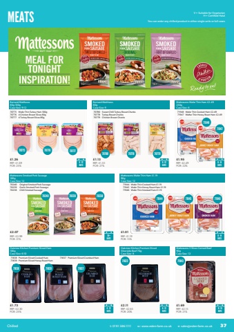 MEATSOakview Kitchen Premium Sliced Ham 100gCase Size: 6-10%u00a31.73RRP: %u00a32.30 POR: 25%71838 718397183871839Premium Sliced Cooked HamPremium Sliced Honey Roast Ham71837 Premium Sliced Crumbed Ham%u00a32.11RRP: %u00a32.65POR: 20%6 - 12DAYSOakview Kitchen Premium Sliced Silverside Beef 70gCase Size: 871622%u00a31.69RRP: %u00a32.15 POR: 21%8 - 14DAYSMattessons 3 Slices Corned Beef 90gCase Size: 12719436 - 12DAYSV = Suitable for Vegetarian H = Certified Halal7183730+DAYS702407023970238Original Smoked Pork Sausage Garlic Smoked Pork SausageChilli Smoked Sausage 70240 70239 70238Bernard Matthews80gCase Size: 9%u00a31.13RRP: %u00a31.55 POR: 27%6 - 12DAYSBernard Matthews80g-100gCase Size: 9-12707757077670777Wafer Thin Turkey Ham 100g4 Chicken Breast Slices 80g 4 Turkey Breast Slices 80g707807077870779Sweet Chilli Turkey Breast ChunksTurkey Breast ChunksChicken Breast Chunks%u00a31.26RRP: %u00a31.69 POR: 25%6 - 12DAYSMattessons Wafer Thin Ham %u00a32.49230gCase Size: 6%u00a31.95RRP: %u00a32.49 POR: 22%71948719477194871947Wafer Thin Cooked Ham %u00a32.49Wafter Thin Honey Roast Ham %u00a32.498 - 14DAYS707807077770778 7077970775 70776Mattessons Wafer Thin Ham %u00a31.1990gCase Size: 12%u00a31.01RRP: %u00a31.19POR: 15%719447194571946Wafer Thin Cooked Ham %u00a31.19Wafer Thin Honey Roast Ham %u00a31.19Wafer Thin Smoked Ham %u00a31.1971944 71945 719468 - 14DAYSMattessons Smoked Pork Sausage 160gCase Size: 12You can order any chilled product in either single units or full cases%u00a32.07RRP: %u00a32.99POR: 31%Chilled t: 0191 586 1111 www.eden-farm.co.uk e: sales@eden-farm.co.uk 37
