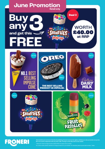 All promotions are correct at the time of publishing. Froneri reserves the right to withdraw or alter promotion at any time.Not to be used in conjunction with any other offer. Pricing is at the discretion of the retailer.June PromotionTHE BEST SELLINGPRODUCT IN IMPULSE. **NO.1 BEST SELLING IMPULSE CONE * Nielsen IQ | Total Coverage | Eat Now CROS & PROS | 12 weeks to 08 June 2024Buy anyFREEand get this3 %u00a340.00WORTHat RRPRetail only4774366236732424 2410For online orders please add free of charge products to your basket. For telesales please quote deal number / letter.Deal 3