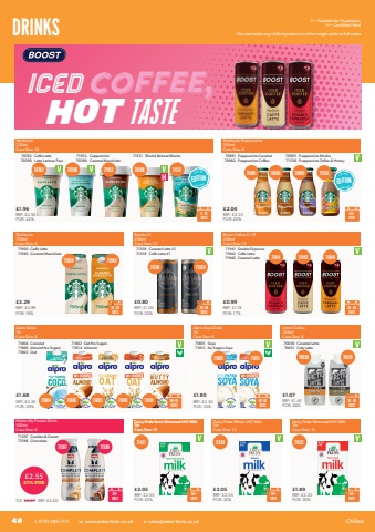 DRINKS%u00a31.07RRP: %u00a31.45POR: 26%Arctic Coffee330mlCase Size: 87003070031Caramel LatteCafe Latte 30 - 60DAYS70030 70031V = Suitable for Vegetarian H = Certified Halal%u00a32.05RRP: %u00a32.55POR: 20%71421Dairy Pride Semi-Skimmed UHT Milk 1ltrCase Size: 12%u00a32.05RRP: %u00a32.55POR: 20%50+DAYS%u00a31.89RRP: %u00a32.35 POR: 20%Dairy Pride Whole UHT Milk1ltrCase Size: 1271420Dairy Pride Skimmed UHT Milk1ltrCase Size: 127142248 t: 0191 586 1111 www.eden-farm.co.uk e: sales@eden-farm.co.uk Chilled60 -60DAYS718047180671803Coconut Almond No SugarsOat7180271814Oat No SugarsAlmond Alpro Drink1ltrCase Size: 8%u00a31.68RRP: %u00a32.35POR: 29%60 -60DAYS7180571813SoyaNo Sugars SoyaAlpro Soya Drink1ltrCase Size: 8%u00a31.80RRP: %u00a32.35POR: 23%71950 7194971358 7135930 - 60DAYS71941 71942 71940%u00a30.80RRP: %u00a31.00POR: 20%6 - 15DAYS70782 70390 70388 71531EDITION70981 70982 70983 7153060+DAYSEDITION30 - 60DAYS30 - 60DAYS7135871359Caramel Latte %u00a31Caffe Latte %u00a31 7195071949Caffe LatteCaramel Macchiato719417194271940Double EspressoCaffe LatteCaramel LatteBarista %u00a31250mlCase Size: 127180471805 7181371806 71803 71802 7181450+DAYS50+DAYS7078270390Caffe LatteLatte Lactose Free7195270388 CappuccinoCaramel Macchiato71531 Blissful Retreat Mocha 7098170982Frappuccino CaramelFrappuccino Coffee7098371530Frappuccino Mocha Frappuccino Toffee & HoneyBoost Coffee %u00a31.19250mlCase Size: 12Starbucks220mlCase Size: 10Starbucks Frappuccino250mlCase Size: 8Starbucks750mlCase Size: 6%u00a31.96RRP: %u00a32.50POR: 22%%u00a32.04RRP: %u00a32.55POR: 20%%u00a33.29RRP: %u00a33.99POR: 18%HOTICEDTASTE COFFEE,71597 7159830+DAYS7159771598Cookies & CreamChocolate71952You can order any chilled product in either single units or full cases%u00a30.99RRP: %u00a31.19POR: 17%M%u00fcller My Protein Drink500mlCase Size: 6%u00a32.55TLP: %u00a32.87 RRP: %u00a33.5027% POR