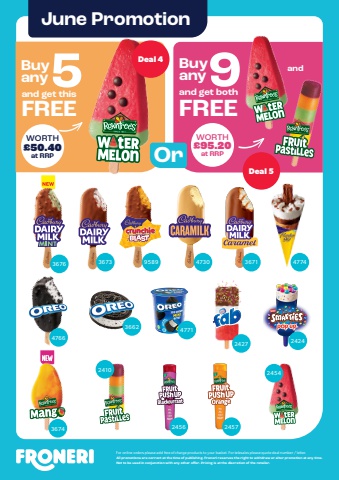 Buy anyAll promotions are correct at the time of publishing. Froneri reserves the right to withdraw or alter promotion at any time.Not to be used in conjunction with any other offer. Pricing is at the discretion of the retailer.June PromotionFREEand get this5Or5%u00a350.40WORTHat RRPFREEand get thisBuy anyandFREE9%u00a395.20WORTHat RRPand get bothBuy any3673 9589 4730 3671 477447663662367647712427 2424367424102456 24572454For online orders please add free of charge products to your basket. For telesales please quote deal number / letter.Deal 4Deal 5