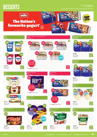 M%u00fcller Corner4pkCase Size: 3DESSERTS V = Suitable for Vegetarian H = Certified HalalRolo Creme Dessert4pkCase Size: 8%u00a31.89RRP: %u00a32.45POR: 23%4 - 7DAYS713944 - 7DAYS%u00a31.51RRP: %u00a32.19POR: 31%7139071392Nestle4pkCase Size: 871391Chilled t: 0191 586 1111 www.eden-farm.co.uk e: sales@eden-farm.co.uk 514 - 8DAYSCadbury Yogurt75gCase Size: 6%u00a31.12RRP: %u00a31.35POR: 17%71825 7182471819EDITION10 - 15DAYSNomadic Yogurt & Oats Crunchy Clusters169gCase Size: 66 - 14DAYS%u00a32.14RRP: %u00a32.75POR: 22%Onken450gCase Size: 6%u00a31.79RRP: %u00a32.19POR: 18%71549 71550715516 - 11DAYS715526 - 14DAYSM%u00fcller Corner 80p124g-136gCase Size: 66 - 14DAYS%u00a30.66RRP: %u00a30.80 POR: 18%M%u00fcller Corner124g-136gCase Size: 66 - 14DAYS%u00a30.91RRP: %u00a31.15 POR: 21%71822 7182371848 718496 - 14DAYSM%u00fcller Light160gCase Size: 12%u00a30.91RRP: %u00a31.15 POR: 21%70025 70033%u00a30.99TLP: %u00a31.14 RRP: %u00a31.6540% POR70172 70173 7017470725EDITION71423717686 - 14DAYSActivia Vanilla Granola Breakfast Pot165gCase Size: 6%u00a31.62RRP: %u00a32.00POR: 19%Activia Strawberry4pkCase Size: 671769You can order any chilled product in either single units or full cases7179771796%u00a32.30TLP: %u00a33.15 RRP: %u00a33.8540% POR4 - 7DAYS71621Cadbury Pots of Joy4pkCase Size: 4%u00a32.20TLP: %u00a33.17 RRP: %u00a33.7541% POR