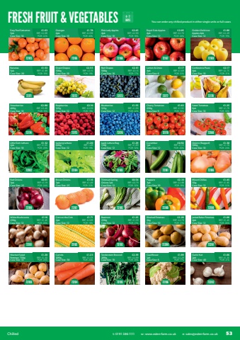 FRESH FRUIT & VEGETABLES72165%u00a31.63RRP: %u00a32.09 POR: 22%Easy Peel Satsumas5pkCase Size: 1072166%u00a31.78RRP: %u00a32.99POR: 40%Oranges 4pkCase Size: 1072177%u00a31.17RRP: %u00a31.69POR: 31%Lemon & Limes4pkCase Size: 672171%u00a31.53RRP: %u00a31.89 POR: 19%Bananas 5pkCase Size: 2072170%u00a32.17RRP: %u00a32.75 POR: 21%Conference Pears4pkCase Size: 1072172%u00a32.55RRP: %u00a33.15 POR: 19%Green Grapes500gCase Size: 1072173%u00a32.61RRP: %u00a33.15 POR: 17%Red Grapes500gCase Size: 1072169%u00a31.86RRP: %u00a32.29 POR: 19%Golden Delicious Apples 4pkCase Size: 1272167%u00a32.05RRP: %u00a32.70POR: 24%Royal Gala Apples 4pkCase Size: 124 - 7DAYS72192%u00a31.71RRP: %u00a32.09 POR: 18%Corn on the Cob2pkCase Size: 1272193%u00a31.25RRP: %u00a31.59 POR: 21%Beetroot250gCase Size: 1272201%u00a31.08RRP: %u00a31.45 POR: 26%Jacket Baker Potatoes4pkCase Size: 1272200%u00a32.20RRP: %u00a32.79 POR: 21%Washed Potatoes2kgCase Size: 1072199%u00a31.20RRP: %u00a31.50POR: 20%Washed Salad Potatoes 750gCase Size: 1472188%u00a30.91RRP: %u00a31.19 POR: 24%Red Onions3pkCase Size: 2572184%u00a31.20RRP: 1.49POR: 19%Iceberg Lettuce600gCase Size: 1272185%u00a30.54RRP: %u00a30.79 POR: 32%Trimmed Spring Onions 1pkCase Size: 1272190%u00a31.45RRP: %u00a31.85POR: 22%Mixed Chillies50gCase Size: 1272189Peppers3pkCase Size: 10%u00a32.33RRP: %u00a32.89POR: 19%Chilled t: 0191 586 1111 www.eden-farm.co.uk e: sales@eden-farm.co.uk 5372182%u00a31.32RRP: %u00a31.65 POR: 20%Little Gem Lettuce2pkCase Size: 1072179%u00a31.63RRP: %u00a31.95POR: 16%Cherry Tomatoes250gCase Size: 972202%u00a31.06RRP: %u00a31.35 POR: 21%Garlic Net2pkCase Size: 4072194%u00a31.23RRP: %u00a31.54 POR: 20%Carrots500gCase Size: 3072174%u00a32.80RRP: %u00a33.45POR: 19%Strawberries400gCase Size: 1072180%u00a31.25RRP: %u00a31.79POR: 30%Salad Tomatoes6pkCase Size: 10You can order any chilled product in either single units or full cases72168%u00a32.45RRP: %u00a32.99 POR: 18%Pink Lady Apples4pkCase Size: 1072183%u00a31.29RRP: %u00a31.89 POR: 32%Leafy Lettuce Bag110gCase Size: 1272195%u00a32.39RRP: %u00a32.99 POR: 20%Tenderstem Broccoli200gCase Size: 1072196%u00a31.89RRP: %u00a32.29 POR: 17%Cauliflower1pkCase Size: 872176%u00a31.55RRP: %u00a31.99 POR: 22%Blueberries125gCase Size: 1272175%u00a32.10RRP: %u00a32.59 POR: 19%Raspberries125gCase Size: 1272186%u00a31.30RRP: %u00a31.70 POR: 24%Onions (Bagged) 500gCase Size: 1072181%u00a30.92RRP: %u00a31.15 POR: 20%Cucumber1pkCase Size: 1272187%u00a31.16RRP: %u00a31.49 POR: 22%Brown Onions3pkCase Size: 2572191%u00a31.16RRP: %u00a31.45 POR: 20%White Mushrooms250gCase Size: 12