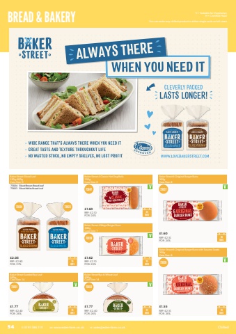 BREAD & BAKERY7303725DAYSV = Suitable for Vegetarian H = Certified Halal54 t: 0191 586 1111 www.eden-farm.co.uk e: sales@eden-farm.co.uk Chilled7304773039Baker Street 6 Original Burger Buns300gCase Size: 8Baker Street 4 Classic Hot Dog Rolls250gCase Size: 8Baker Street 4 Mega Burger Buns300gCase Size: 7%u00a31.60RRP: %u00a32.10 POR: 24%25DAYS25DAYS25DAYS73032Baker Street Rye & Wheat Loaf500gCase Size: 1425DAYS73031Baker Street Seeded Rye Loaf500gCase Size: 1425DAYS%u00a31.60RRP: %u00a32.10 POR: 24%%u00a31.62RRP: %u00a32.10 POR: 23% 7303825DAYSBaker Street 6 Original Burger Buns with Sesame Seeds 300gCase Size: 8%u00a31.55RRP: %u00a32.10 POR: 26%7302473023Sliced Brown Bread LoafSliced White Bread Loaf73024 73023You can order any chilled product in either single units or full cases%u00a32.05RRP: %u00a32.80 POR: 27%Baker Street Sliced Loaf550g-600gCase Size: 9%u00a31.77RRP: %u00a32.40 POR: 26%%u00a31.77RRP: %u00a32.40 POR: 26%
