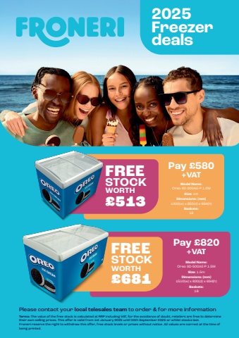 Model Name:Oreo SD-300AE-P 1.0MSize: 1mDimensions: (mm)1000(w) x 850(d) x 694(h)Baskets:12Model Name:Oreo SD-500AE-P 1.5MSize: 1.5mDimensions: (mm)1510(w) x 830(d) x 694(h)Baskets: 18Pay %u00a3580 +VATPay %u00a3820+VATFREESTOCKWORTH%u00a3513FREESTOCKWORTH%u00a3681Please contact your local telesales team to order & for more informationTerms: The value of the free stock is calculated at RRP including VAT, for the avoidance of doubt, retailers are free to determine their own selling prices. This offer is valid from 1st January 2025 until 30th September 2025 or whilst stocks last. Froneri reserve the right to withdraw this offer, free stock levels or prices without notice. All values are correct at the time of being printed.2025 Freezer deals