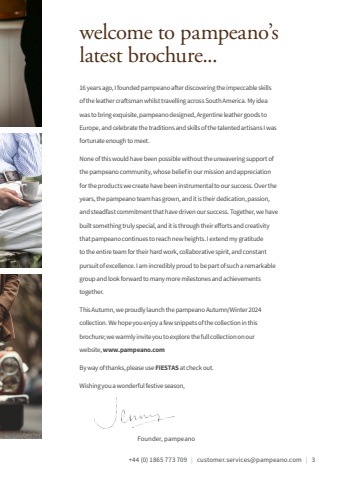 +44 (0) 1865 773 709 | customer.services@pampeano.com | 3welcome to pampeano%u2019s latest brochure...16 years ago, I founded pampeano after discovering the impeccable skills of the leather craftsman whilst travelling across South America. My idea was to bring exquisite, pampeano designed, Argentine leather goods to Europe, and celebrate the traditions and skills of the talented artisans I was fortunate enough to meet. None of this would have been possible without the unwavering support of the pampeano community, whose belief in our mission and appreciation for the products we create have been instrumental to our success. Over the years, the pampeano team has grown, and it is their dedication, passion, and steadfast commitment that have driven our success. Together, we have built something truly special, and it is through their efforts and creativity that pampeano continues to reach new heights. I extend my gratitude to the entire team for their hard work, collaborative spirit, and constant pursuit of excellence. I am incredibly proud to be part of such a remarkable group and look forward to many more milestones and achievements together. This Autumn, we proudly launch the pampeano Autumn/Winter 2024 collection. We hope you enjoy a few snippets of the collection in this brochure; we warmly invite you to explore the full collection on our website, www.pampeano.com By way of thanks, please use FIESTAS at check out.Wishing you a wonderful festive season, Founder, pampeano