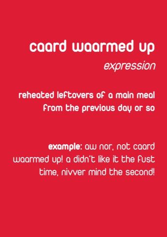 caard waarmed upexpressionreheated leftovers of a main meal from the previous day or soexample: aw nor, not caard waarmed up! a didn%u2019t like it the fust time, nivver mind the second!