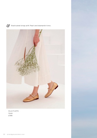 29 airandgracelondon.comELLA FLATS:Gold%u00a3199Elasticated strap with Pearl and diamant%u00e9 trims.