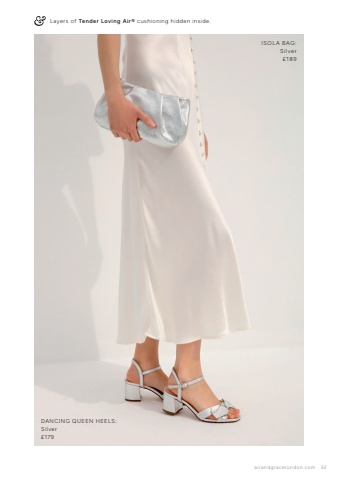 airandgracelondon.com 32DANCING QUEEN HEELS:Silver%u00a3179ISOLA BAG:Silver%u00a3189Layers of Tender Loving Air%u00ae cushioning hidden inside.
