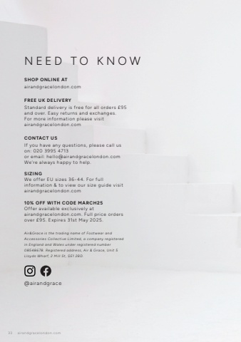 STYLE NAME:COLOUROther Colours Available%u00a3000Layers of comfort cushioning33 airandgracelondon.comNEED TO KNOWSHOP ONLINE ATairandgracelondon.comFREE UK DELIVERYStandard deliver y is free for all orders %u00a395 and over. Easy returns and exchanges. For more information please visit airandgracelondon.comCONTACT USIf you have any questions, please call us on: 020 3995 4713or email: hello@airandgracelondon.com We%u2019re always happy to help.SIZING We offer EU sizes 36-44. For full information & to view our size guide visit airandgracelondon.com10% OFF WITH CODE MARCH25Offer available exclusively at airandgracelondon.com. Full price orders over %u00a395. Expires 31st May 2025.Air&Grace is the trading name of Footwear and Accessories Collective Limited, a company registered in England and Wales under registered number 08548678. Registered address, Air & Grace, Unit 5 Lloyds Wharf, 2 Mill St, SE1 2BD.@airandgrace