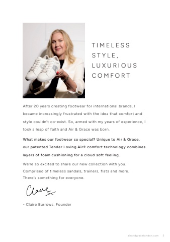 airandgracelondon.com 2- Claire Burrows, FounderTIMELESSSTYLE,LUXURIOUSCOMFORTAfter 20 years creating footwear for international brands, I became increasingly frustrated with the idea that comfort and style couldn%u2019t co-exist. So, armed with my years of experience, I took a leap of faith and Air & Grace was born.What makes our footwear so special? Unique to Air & Grace, our patented Tender Loving Air%u00ae comfort technology combines layers of foam cushioning for a cloud soft feeling.We%u2019re so excited to share our new collection with you. Comprised of timeless sandals, trainers, flats and more.There%u2019s something for everyone.
