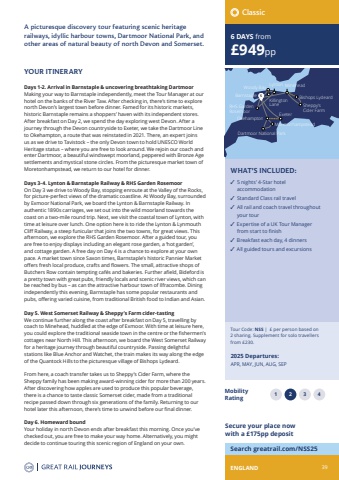 A picturesque discovery tour featuring scenic heritage railways, idyllic harbour towns, Dartmoor National Park, and other areas of natural beauty of north Devon and Somerset.6 DAYS from%u00a3949ppDays 1-2. Arrival in Barnstaple & uncovering breathtaking DartmoorMaking your way to Barnstaple independently, meet the Tour Manager at our hotel on the banks of the River Taw. After checking in, there%u2019s time to explore north Devon%u2019s largest town before dinner. Famed for its historic markets, historic Barnstaple remains a shoppers%u2019 haven with its independent stores. After breakfast on Day 2, we spend the day exploring west Devon. After a journey through the Devon countryside to Exeter, we take the Dartmoor Line to Okehampton, a route that was reinstated in 2021. There, an expert joins us as we drive to Tavistock %u2013 the only Devon town to hold UNESCO World Heritage status %u2013 where you are free to look around. We rejoin our coach and enter Dartmoor, a beautiful windswept moorland, peppered with Bronze Age settlements and mystical stone circles. From the picturesque market town of Moretonhampstead, we return to our hotel for dinner.Days 3-4. Lynton & Barnstaple Railway & RHS Garden RosemoorOn Day 3 we drive to Woody Bay, stopping enroute at the Valley of the Rocks, for picture-perfect views of the dramatic coastline. At Woody Bay, surrounded by Exmoor National Park, we board the Lynton & Barnstaple Railway. In authentic 1890s carriages, we set out into the wild moorland towards the coast on a two-mile round trip. Next, we visit the coastal town of Lynton, with time at leisure over lunch. One option here is to ride the Lynton & Lynmouth Cliff Railway, a steep funicular that joins the two towns, for great views. This afternoon, we explore the RHS Garden Rosemoor. After a guided tour, you are free to enjoy displays including an elegant rose garden, a %u2018hot garden%u2019, and cottage garden. A free day on Day 4 is a chance to explore at your own pace. A market town since Saxon times, Barnstaple%u2019s historic Pannier Market offers fresh local produce, crafts and flowers. The small, attractive shops of Butchers Row contain tempting caf%u00e9s and bakeries. Further afield, Bideford is a pretty town with great pubs, friendly locals and scenic river views, which can be reached by bus %u2013 as can the attractive harbour town of Ilfracombe. Dining independently this evening, Barnstaple has some popular restaurants and pubs, offering varied cuisine, from traditional British food to Indian and Asian. Day 5. West Somerset Railway & Sheppy%u2019s Farm cider-tastingWe continue further along the coast after breakfast on Day 5, travelling by coach to Minehead, huddled at the edge of Exmoor. With time at leisure here, you could explore the traditional seaside town in the centre or the fishermen%u2019s cottages near North Hill. This afternoon, we board the West Somerset Railway for a heritage journey through beautiful countryside. Passing delightful stations like Blue Anchor and Watchet, the train makes its way along the edge of the Quantock Hills to the picturesque village of Bishops Lydeard.From here, a coach transfer takes us to Sheppy%u2019s Cider Farm, where the Sheppy family has been making award-winning cider for more than 200 years. After discovering how apples are used to produce this popular beverage, there is a chance to taste classic Somerset cider, made from a traditional recipe passed down through six generations of the family. Returning to our hotel later this afternoon, there%u2019s time to unwind before our final dinner. Day 6. Homeward boundYour holiday in north Devon ends after breakfast this morning. Once you%u2019ve checked out, you are free to make your way home. Alternatively, you might decide to continue touring this scenic region of England on your own. YOUR ITINERARYSecure your place now with a %u00a3175pp deposit2025 Departures: APR, MAY, JUN, AUG, SEPTour Code: NSS | %u00a3 per person based on 2 sharing. Supplement for solo travellers from %u00a3230.WHAT%u2019S INCLUDED:%u2713 5 nights%u2019 4-Star hotel accommodation %u2713 Standard Class rail travel %u2713 All rail and coach travel throughout your tour%u2713 Expertise of a UK Tour Manager from start to finish%u2713 Breakfast each day, 4 dinners %u2713 All guided tours and excursionsBarnstapleExeterOkehamptonDartmoor National ParkMoretonhampsteadWoody BayKillingtonLaneLyntonRHS GardenRosemoorBishops LydeardMineheadSheppy%u2019sCider Farm5Mobility Rating 1 2 3 4ENGLAND 39Search greatrail.com/NSS25Classic