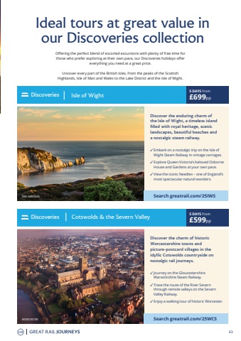 Ideal tours at great value in our Discoveries collectionOffering the perfect blend of escorted excursions with plenty of free time for those who prefer exploring at their own pace, our Discoveries holidays offer everything you need at a great price.Uncover every part of the British Isles, from the peaks of the Scottish Highlands, Isle of Man and Wales to the Lake District and the Isle of Wight.%u2713 Embark on a nostalgic trip on the Isle of Wight Steam Railway in vintage carriages.%u2713 Explore Queen Victoria%u2019s beloved Osborne House and Gardens at your own pace.%u2713 View the iconic Needles %u2013 one of England%u2019s most spectacular natural wonders. %u2713 Journey on the Gloucestershire Warwickshire Steam Railway.%u2713 Trace the route of the River Severn through remote valleys on the Severn Valley Railway.%u2713 Enjoy a walking tour of historic Worcester.Discover the enduring charm of the Isle of Wight, a timeless island filled with royal heritage, scenic landscapes, beautiful beaches and a nostalgic steam railway.Discover the charm of historic Worcestershire towns and picture-postcard villages in the idyllic Cotswolds countryside on nostalgic rail journeys.Isle of WightCotswolds & the Severn Valley5 DAYS from5 DAYS from%u00a3699pp%u00a3599ppSearch greatrail.com/25IWSSearch greatrail.com/25WCSTHE NEEDLESWORCESTERDiscoveriesDiscoveries43