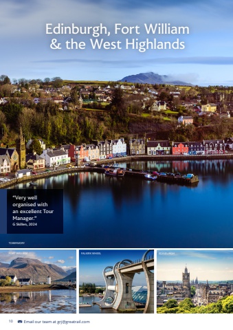 Edinburgh, Fort William & the West HighlandsTOBERMORYEDINBURGH%u201cVery well organised with an excellent Tour Manager.%u201dG Skillen, 202410FORT WILLIAM FALKIRK WHEELEmail our team at grj@greatrail.com