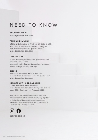 STYLE NAME:COLOUROther Colours Available%u00a3000Layers of comfort cushioning33 airandgracelondon.comNEED TO KNOWSHOP ONLINE ATairandgracelondon.comFREE UK DELIVERYStandard deliver y is free for all orders %u00a395 and over. Easy returns and exchanges. For more information please visit airandgracelondon.comCONTACT USIf you have any questions, please call us on: 020 3995 4713or email: hello@airandgracelondon.com We%u2019re always happy to help.SIZING We offer EU sizes 36-44. For full information & to view our size guide visit airandgracelondon.com15% OFF WITH CODE AGDM15Offer available exclusively at airandgracelondon.com. Full price orders over %u00a395. Expires 31st August 2025.Air&Grace is the trading name of Footwear and Accessories Collective Limited, a company registered in England and Wales under registered number 08548678. Registered address, Air & Grace, Unit 5 Lloyds Wharf, 2 Mill St, SE1 2BD.@airandgrace