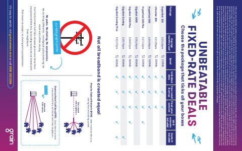 It%u2019s easy to switch, visit grainconnect.com or call 0330 223 2266 Choose the package that ticks all your boxes UNBEATABLE FIXED-RATE DEALS Package Average monthly cost* Speed Unlimited data Free install & set-up Fixed price contract Wi-Fi included extender included Static IP Superfast 150 %u00a319.16pm 150Mb Ultrafast 300 %u00a321.99pm 300Mb Hyperfast 500 %u00a324.49pm 500Mb Hyperfast 500 Plus %u00a327.12pm 500Mb Gigafast 1000 %u00a326.24pm 900Mb Gigafast 1000 Plus %u00a328.87pm 900Mb Gigafast Gaming %u00a329.74pm 900Mb Gigafast Gaming Plus %u00a332.37pm 900Mb Guide. Leaflet intended for this address only. Grain reserves the right to withdraw the offer at any time. Full T&Cs at grainconnect.com/legals. Wi-Fi. A wired connection is required for maximum speed. Actual speeds may vary depending on distance from router/extender, usage, and connected equipment. Renewal prices can be found in the Price based on Ofcom opinion that Full-Fibre is better for speed and reliability. Average monthly cost inclusive of free month offer. Speeds quoted are to the router; 900Mb not achievable by a single device over starting on 17/05/2025, inclusive of the advertised annual contract price increases and the advertised out-of-contract prices. Trustpilot scores correct as of 28/04/2025. UK%u2019s best broadband tech claim fees, in-contract price rises, and advertised out-of-contract prices. Grain saving based on customer signing up and being installed by 30/06/2025. Virgin comparison based on a 24-month contract period Offer cannot be used in conjunction with any other promotion. Saving amount based on a comparison with like-for-like packages from other broadband providers as of 29/04/2025, inclusive of additional midnight on 30/06/2025. Any customer who starts their contract after 30/6/2025 will revert to the lower number of free months for their package. Free month(s) begin from the second month of service. advertised number of free months Superfast (1 month), Ultrafast (2 months), Hyperfast (3 months) and Gigafast (3 months) customers must have started their contract and had their service activated by contract term. Customers who sign up by 13/06/2025 will receive the following free periods: Superfast (0 months), Ultrafast (1 month), Hyperfast (2 months) and Gigafast (2 months). To receive the full *Offer valid until 13/06/2025. Available to new customers only who have not had an active Grain connection at the same address within the past 6 calendar months. Discount applies for the full 24-month Not all broadband is created equal This is us No poles. No sharing. No compromise. We do things differently - no telegraph poles cluttering the street and no fibre-sharing. Our Point-to-Point Full Fibre network gives every home their own personal fibre line, laid underground and not shared with their neighbours. That means no copper, no sharing and no compromises. No telegraph poles Dedicated fibre cables Point-to-Point Full Fibre (PTP) - Every home has their own personal fibre, not shared with their neighbours. Passive Optical Network (PON) - what most providers use, sharing fibre and sharing speeds. Fibre shared with neighbours