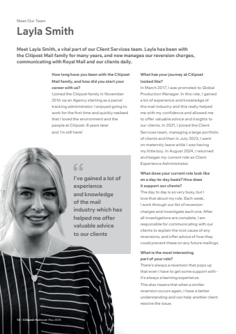 14 | Citipost Mailroom May 2025How long have you been with the Citipost Mail family, and how did you start your career with us? I joined the Citipost family in November 2016 via an Agency starting as a parcel tracking administrator. I enjoyed going to work for the first time and quickly realised that I loved the environment and the people at Citipost. 8 years later and I%u2019m still here! What has your journey at Citipost looked like? In March 2017, I was promoted to Global Production Manager. In this role, I gained a lot of experience and knowledge of the mail industry and this really helped me with my confidence and allowed me to offer valuable advice and insights to our clients. In 2021, I joined the Client Services team, managing a large portfolio of clients and then in July 2023, I went on maternity leave while I was having my little boy. In August 2024, I returned and began my current role as Client Experience Administrator. What does your current role look like on a day-to-day basis? How does it support our clients? The day to day is so very busy, but I love that about my role. Each week, I work through our list of reversion charges and investigate each one. After all investigations are complete, I am responsible for communicating with our clients to explain the root cause of any reversions, and offer advice of how they could prevent these on any future mailings.What is the most interesting part of your role? There%u2019s always a reversion that pops up that even I have to get some support with - it%u2019s always a learning experience. This also means that when a similar reversion occurs again, I have a better understanding and can help another client resolve the issue. Meet Our TeamLayla SmithMeet Layla Smith, a vital part of our Client Services team. Layla has been with the Citipost Mail family for many years, and now manages our reversion charges, communicating with Royal Mail and our clients daily. 14 | Citipost Mailroom May 2025I've gained a lot of experience and knowledge of the mail industry which has helped me offer valuable advice to our clients