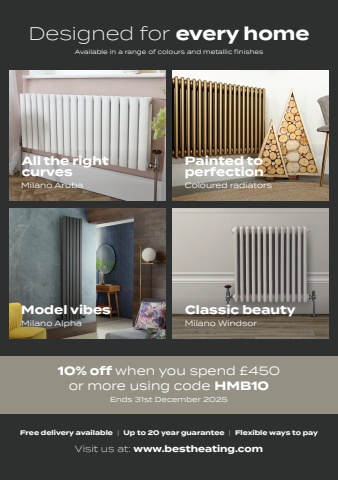 10% off when you spend %u00a3450or more using code HMB10Ends 31st December 2025Available in a range of colours and metallic finishesDesigned for every homeVisit us at: www.bestheating.comFree delivery available | Up to 20 year guarantee | Flexible ways to payAll the rightcurvesMilano ArubaPainted toperfectionColoured radiatorsClassic beautyMilano WindsorModel vibesMilano Alpha