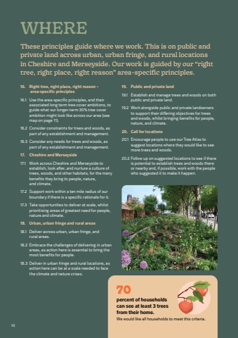 16. Right tree, right place, right reason %u2013 area-specific principles16.1 Use the area-specific principles, and their associated long term tree cover ambitions, to guide what our longer-term 30% tree cover ambition might look like across our area (see map on page 11). 16.2 Consider constraints for trees and woods, as part of any establishment and management.16.3 Consider any needs for trees and woods, as part of any establishment and management.17. Cheshire and Merseyside17.1 Work across Cheshire and Merseyside to establish, look aft er, and nurture a culture of trees, woods, and other habitats, for the many benefits they bring to people, nature, and climate.17.2 Support work within a ten mile radius of our boundary if there is a specific rationale for it. 17.3 Take opportunities to deliver at scale, whilst prioritising areas of greatest need for people, nature and climate.18. Urban, urban fringe and rural areas18.1 Deliver across urban, urban fringe, and rural areas.18.2 Embrace the challenges of delivering in urban areas, as action here is essential to bring the most benefits for people.18.3 Deliver in urban fringe and rural locations, as action here can be at a scale needed to face the climate and nature crises.19. Public and private land19.1 Establish and manage trees and woods on both public and private land.19.2 Work alongside public and private landowners to support their diff ering objectives for trees and woods, whilst bringing benefits for people, nature, and climate.20. Call for locations20.1 Encourage people to use our Tree Atlas to suggest locations where they would like to see more trees and woods.20.2 Follow up on suggested locations to see if there is potential to establish trees and woods there or nearby and, if possible, work with the people who suggested it to make it happen.These principles guide where we work. This is on public and private land across urban, urban fringe, and rural locations in Cheshire and Merseyside. Our work is guided by our %u201cright tree, right place, right reason%u201d area-specific principles.WHERE70percent of households can see at least 3 treesfrom their home. We would like all households to meet this criteria.10