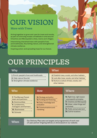 3Our Delivery Plan sets out targets and programmes of work over a 5 year period. Ongoing delivery is showcased on our website.1. Enrich people%u2019s lives and livelihoods7. The Mersey Forest team and partners12. Strategy and policy 16. Right tree, right reason - area-specific principles9. Landowners, managers and farmers14. Data, knowledge and evaluation17. Cheshire and Merseyside18. Urban, urban fringe and rural areas10. Businesses15. Communications and marketing 19. Public and private land20. Call for locations 11. Schools8. Communities13. Funding and financing2. Help nature flourish3. Strengthen climate resilience4. Establish trees, woods, and other habitats5. Look after trees, woods, and other habitats6. Nurture a culture of trees, woods, and other habitatsActing together to grow and care for trees and woods, as part of a thriving mosaic of habitats in and around Cheshire and Merseyside%u2019s cities, towns and villages.Intertwining cherished trees with people%u2019s livesand livelihoods, flourishing nature, and strengthenedclimate resilience.Inspiring action and spreading hope for our future.More with TreesOUR VISIONOUR PRINCIPLESWhyWhenWho How WhereWhat3