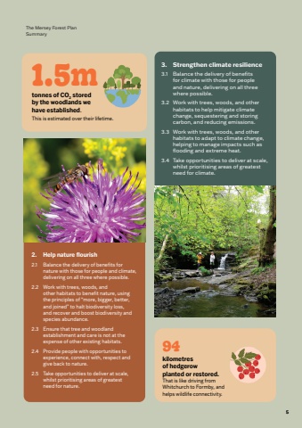 5The Mersey Forest PlanSummary3. Strengthen climate resilience3.1 Balance the delivery of benefits for climate with those for people and nature, delivering on all three where possible.3.2 Work with trees, woods, and other habitats to help mitigate climate change, sequestering and storing carbon, and reducing emissions.3.3 Work with trees, woods, and other habitats to adapt to climate change, helping to manage impacts such as flooding and extreme heat.3.4 Take opportunities to deliver at scale, whilst prioritising areas of greatest need for climate. 2. Help nature flourish2.1 Balance the delivery of benefits for nature with those for people and climate, delivering on all three where possible.2.2 Work with trees, woods, and other habitats to benefit nature, using the principles of %u201cmore, bigger, bett er, and joined%u201d to halt biodiversity loss, and recover and boost biodiversity and species abundance.2.3 Ensure that tree and woodland establishment and care is not at the expense of other existing habitats.2.4 Provide people with opportunities to experience, connect with, respect and give back to nature.2.5 Take opportunities to deliver at scale, whilst prioritising areas of greatest need for nature.1.5mtonnes of CO2 storedby the woodlands wehave established.This is estimated over their lifetime.594kilometres of hedgerow planted or restored. That is like driving from Whitchurch to Formby, and helps wildlife connectivity.5