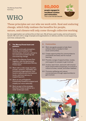 7The Mersey Forest PlanSummaryNo one organisation can achieve this on their own. We all have a part to play, and we all stand to benefit. We work with a range of people and organisations on delivery and the crucial supporting work that underpins this.8. Communities8.1 Work alongside people to help them achieve what is needed in their local communities. 8.2 Create opportunities for communities to contribute and lead, and for mutual learning.8.3 Provide a range of opportunities, routes, and support for people to get involved.8.4 Involve, learn from, and work with diverse local communities and groups, to nurture a culture of trees, woods, and other habitats. 8.5 Promote wellbeing and nature connectedness through opportunities to get involved.These principles set out who we work with. Real and enduring change, which fully realises the benefits for people,nature, and climate will only come through collective working. WHO50,000people engaged in woodland creationand restoration.This is over the last decade.77. The Mersey Forest team and partners7.1 Seek to continually strengthen, develop, and establish new partnerships, which are central to our work and to achieving real and enduring change.7.2 Deliver The Mersey Forest Plan together, with the partnership supported by a dedicated Mersey Forest team.7.3 Work with a wide range of public, private, research, charitable, and community organisations, from local to national and international levels, and from delivery to supporting work.7.4 Work as one of England%u2019s Community Forests to support and amplify our voice nationally.7.5 Work as part of the strategic Northern Forest to deliver at a wider landscape scale.