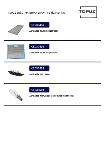 TOPUZ SOĞUTMA ISITMA SANAYİ VE TİCARET A.Ş. KE030435 ASPİRATÖR TEL FİLTRE (267*305) KE030436 ASPİRATÖR TEL FİLTRE (300*345) KE030501 ASPİRATÖR TUŞ TAKIMI KE030601 ASPİRATÖR AMPUL (220-240 VOLT 28 WATT 50 HZ)