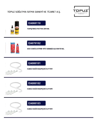 TOPUZ SOĞUTMA ISITMA SANAYİ VE TİCARET A.Ş. EA060110 YAPIŞTIRICI PATTEX 200 ML EA070102 SIVI CONTA HYPER-RTV KIRMIZI ALCON 50 ML EA080101 KABLO BAĞI KELEPÇESİ 3,6*250 EA080102 KABLO BAĞI KELEPÇESİ 3,6*205 EA080103 KABLO BAĞI KELEPÇESİ 3,6*300