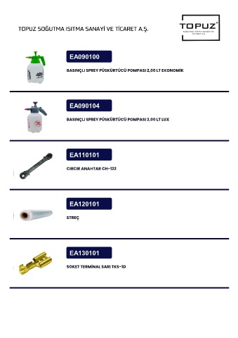 TOPUZ SOĞUTMA ISITMA SANAYİ VE TİCARET A.Ş. EA090100 BASINÇLI SPREY PÜSKÜRTÜCÜ POMPASI 2,00 LT EKONOMİK EA090104 BASINÇLI SPREY PÜSKÜRTÜCÜ POMPASI 2,00 LT LUX EA110101 CIRCIR ANAHTAR CH-122 EA120101 STREÇ EA130101 SOKET TERMİNAL SARI TKS-1D