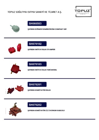 TOPUZ SOĞUTMA ISITMA SANAYİ VE TİCARET A.Ş. SH060503 ŞOFBEN DÜĞMESİ DEMİRDÖKÜM COMPAKT GRİ SH070102 ŞOFBEN SWİTCH İHLAS 25 AMPER SH070103 ŞOFBEN SWİTCH İHLAS YENİ MODEL SH070201 ŞOFBEN KOMÜTATÖR İHLAS SH070202 ŞOFBEN KOMÜTATÖR 2'Lİ 3 KONUM KABLOLU
