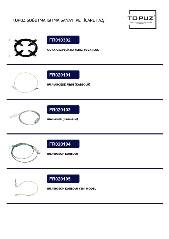 TOPUZ SOĞUTMA ISITMA SANAYİ VE TİCARET A.Ş. FR010302 OCAK CEZVELİK KAYMAZ YUVARLAK FR020101 BUJİ ARÇELİK FIRIN (KABLOLU) FR020103 BUJİ AUER (KABLOLU) FR020104 BUJİ BOSCH KABLOLU FR020105 BUJİ BOSCH KABLOLU YENİ MODEL