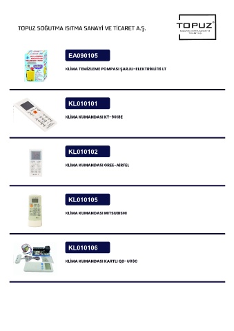 TOPUZ SOĞUTMA ISITMA SANAYİ VE TİCARET A.Ş. EA090105 KLİMA TEMİZLEME POMPASI ŞARJLI-ELEKTRİKLİ 16 LT KL010101 KLİMA KUMANDASI KT-9018E KL010102 KLİMA KUMANDASI GREE-AİRFEL KL010105 KLİMA KUMANDASI MITSUBISHI KL010106 KLİMA KUMANDASI KARTLI QD-U03C
