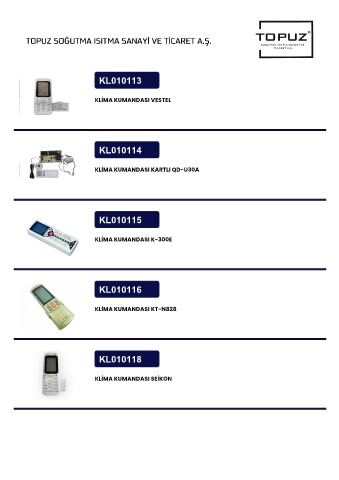 TOPUZ SOĞUTMA ISITMA SANAYİ VE TİCARET A.Ş. KL010113 KLİMA KUMANDASI VESTEL KL010114 KLİMA KUMANDASI KARTLI QD-U30A KL010115 KLİMA KUMANDASI K-300E KL010116 KLİMA KUMANDASI KT-N828 KL010118 KLİMA KUMANDASI SEİKON
