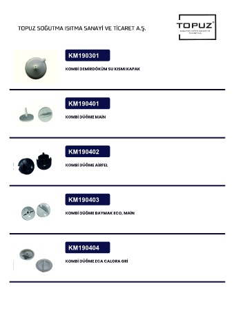 TOPUZ SOĞUTMA ISITMA SANAYİ VE TİCARET A.Ş. KM190301 KOMBİ DEMİRDÖKÜM SU KISMI KAPAK KM190401 KOMBİ DÜĞME MAİN KM190402 KOMBİ DÜĞME AİRFEL KM190403 KOMBİ DÜĞME BAYMAK ECO, MAİN KM190404 KOMBİ DÜĞME ECA CALORA GRİ