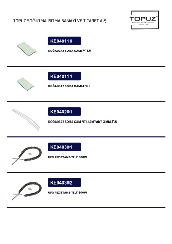 TOPUZ SOĞUTMA ISITMA SANAYİ VE TİCARET A.Ş. KE040110 DOĞALGAZ SOBA CAMI 7*13,5 KE040111 DOĞALGAZ SOBA CAMI 4*8,5 KE040201 DOĞALGAZ SOBA CAM FİTİLİ AMYANT 3 MM 3'LÜ KE040301 UFO REZİSTANS TELİ 1500W KE040302 UFO REZİSTANS TELİ 1800W