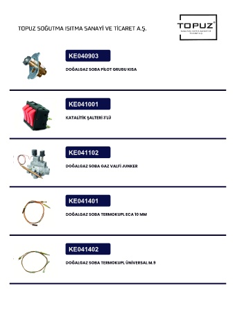 TOPUZ SOĞUTMA ISITMA SANAYİ VE TİCARET A.Ş. KE040903 DOĞALGAZ SOBA PİLOT GRUBU KISA KE041001 KATALİTİK ŞALTERİ 3'LÜ KE041102 DOĞALGAZ SOBA GAZ VALFİ JUNKER KE041401 DOĞALGAZ SOBA TERMOKUPL ECA 10 MM KE041402 DOĞALGAZ SOBA TERMOKUPL ÜNİVERSAL M.9