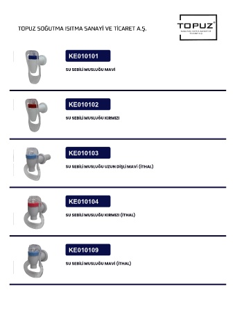 TOPUZ SOĞUTMA ISITMA SANAYİ VE TİCARET A.Ş. KE010101 SU SEBİLİ MUSLUĞU MAVİ KE010102 SU SEBİLİ MUSLUĞU KIRMIZI KE010103 SU SEBİLİ MUSLUĞU UZUN DİŞLİ MAVİ (İTHAL) KE010104 SU SEBİLİ MUSLUĞU KIRMIZI (İTHAL) KE010109 SU SEBİLİ MUSLUĞU MAVİ (İTHAL)
