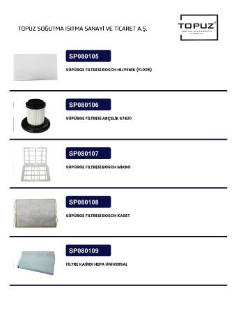 TOPUZ SOĞUTMA ISITMA SANAYİ VE TİCARET A.Ş. SP080105 SÜPÜRGE FİLTRESİ BOSCH HİJYENİK (FL005) SP080106 SÜPÜRGE FİLTRESİ ARÇELİK S7420 SP080107 SÜPÜRGE FİLTRESİ BOSCH MİKRO SP080108 SÜPÜRGE FİLTRESİ BOSCH KASET SP080109 FİLTRE KAĞIDI HEPA ÜNİVERSAL