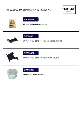 TOPUZ SOĞUTMA ISITMA SANAYİ VE TİCARET A.Ş. SP090256 SÜPÜRGE KAĞIT TORBA FAKİR DUO SP090301 SÜPÜRGE TORBA KIZAĞI BOSCH LOGO-SİEMENS 00495701 SP090302 SÜPÜRGE TORBA KIZAĞI BOSCH ERGOMAX-SİEMENS SP110204 SÜPÜRGE BEZ TORBA ROWENTA
