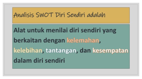 Analisis SWOT Diri Sendiri adalah Alat untuk menilai diri sendiri yang berkaitan dengan kelemahan, kelebihan, tantangan, dan kesempatan dalam diri sendiri
