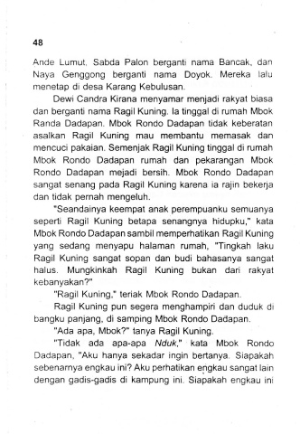 "Ada apa, Mbok?" tanya Ragil Kuning.