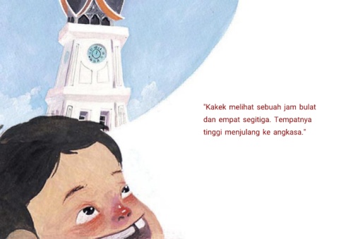 "Kakek melihat sebuah jam bulat dan empat segitiga. Tempatnya tinggi menjulang ke angkasa."