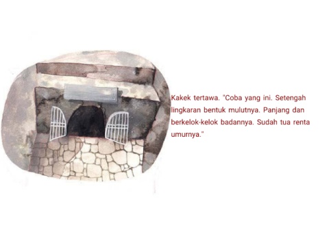 Kakek tertawa. "Coba yang ini. Setengah lingkaran bentuk mulutnya. Panjang dan berkelok-kelok badannya. Sudah tua renta umurnya."