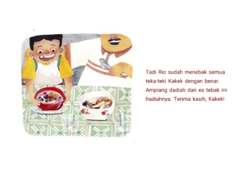 Tadi Rio sudah menebak semua teka-teki Kakek dengan benar. Ampiang dadiah dan es tebak ini hadiahnya. Terima kasih, Kakek!
