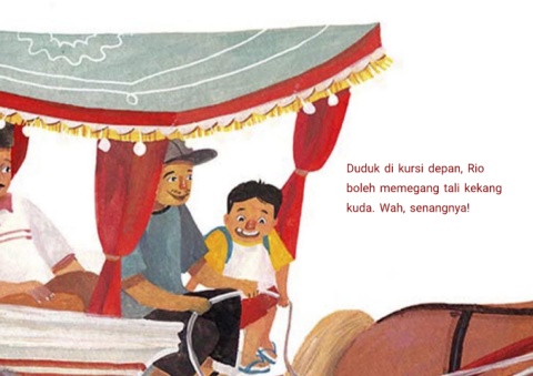 Duduk di kursi depan, Rio boleh memegang tali kekang kuda. Wah, senangnya!