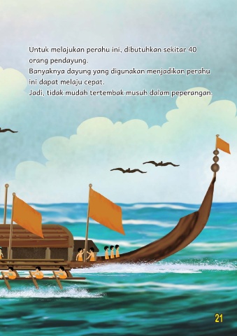 Untuk melajukan perahu ini, dibutuhkan sekitar 40 orang pendayung. Banyaknya dayung yang digunakan menjadikan perahu ini dapat melaju cepat. Jadi, tidak mudah tertembak musuh dalam peperangan. 21