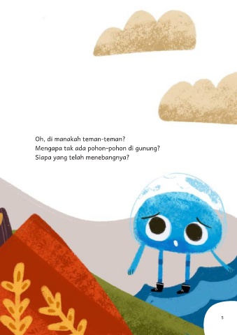 Oh, di manakah teman-teman? Mengapa tak ada pohon-pohon di gunung? Siapa yang telah menebangnya? 5